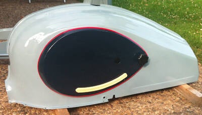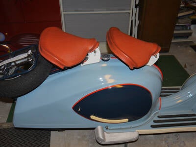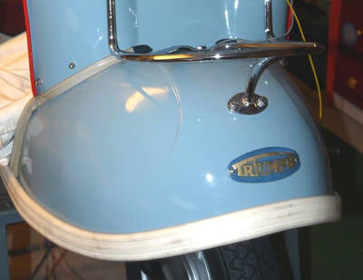 Farbgebung: Sie entspricht genau den um 1955 verwendeten Farben und gibt in ihren Kontrasten ein edles Gesamtbild ab. Kleinigkeiten, wie das farblich passende Originallogo “Triumph” runden das äußere Bild des Rollers ab.