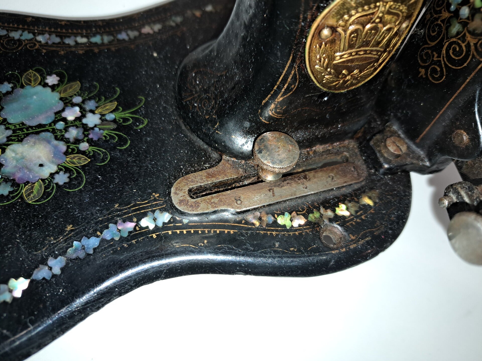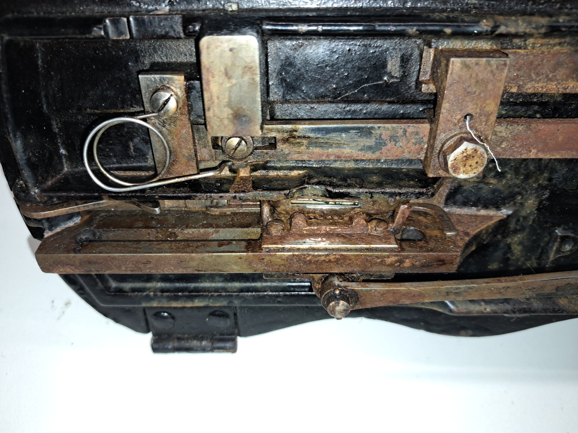 Der Ausbau der Schieber über dem Schiffchen gestaltete sich äußerst schwierig. Sie wurden mit Übermaß gefertigt und damals anscheinend mit Gewalt eingefügt. Erst massiver Abtrag an Material ließ es zu, dass diese wieder eingesetzt werden konnten. Daher meine These, dass diese Maschine nicht benutzt wurde, da ein Austausch des Spulers nicht möglich war.
